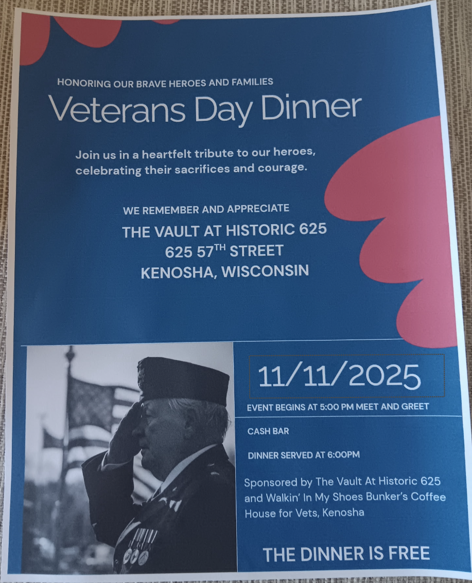 Our annual veterans day dinner will be on 11/11/2025 downtown at “The Vault At Historic 625”, 625 57th St, Kenosha. Come meet old friends and make new ones.